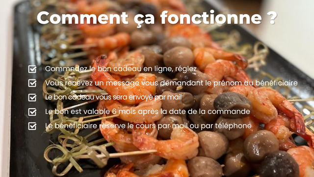 Le bénéficiaire du bon devra me contacter par mail ou par téléphone pour réserver le cours de cuisine. Il n'est pas possible de réserver en ligne.